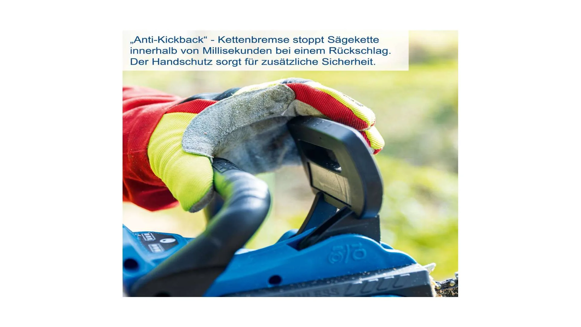 Sigurnost je na prvom mjestu dvoručni sigurnosni prekidač, kočnica lanca protiv povratnog udara i zaštita ruku garantuju bezbrižan rad.