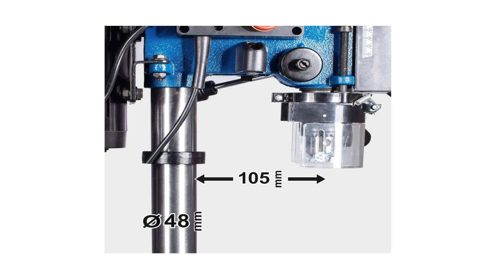 Kompaktna osnovna ploča dimenzija 208 x 341 mm pruža dodatnu stabilnost, a maksimalna udaljenost između stezne glave i postolja je 405 mm.