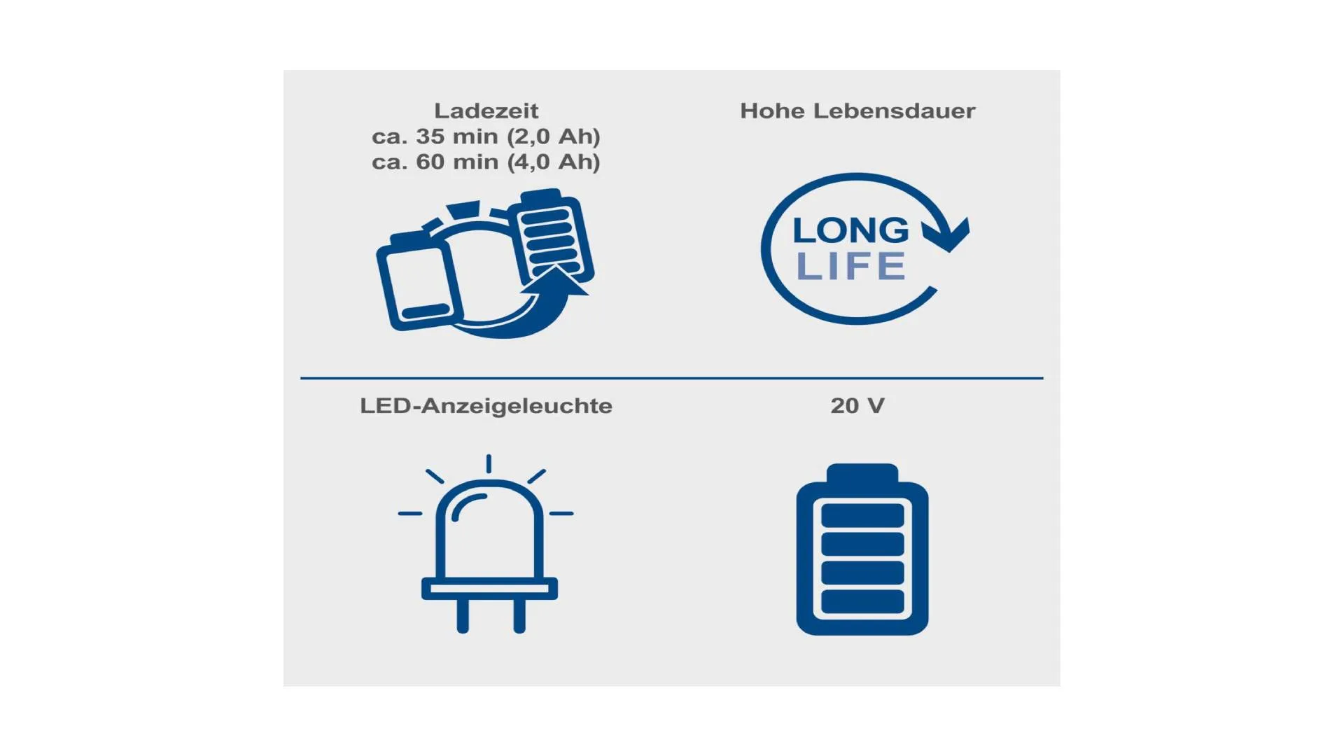 Brzo punjenje – 2,0 Ah baterija napunjena otprilike za 35 minuta, 4,0 Ah baterija 60 minuta.