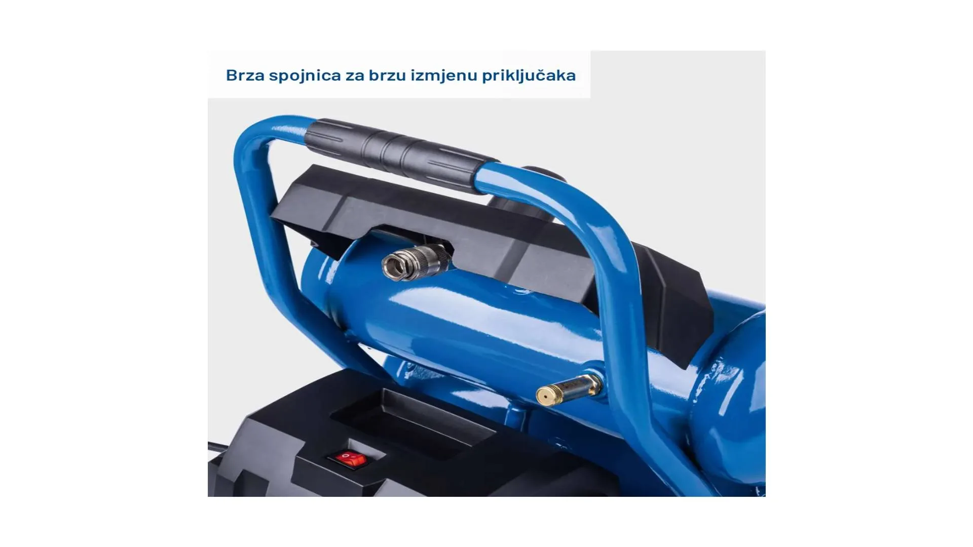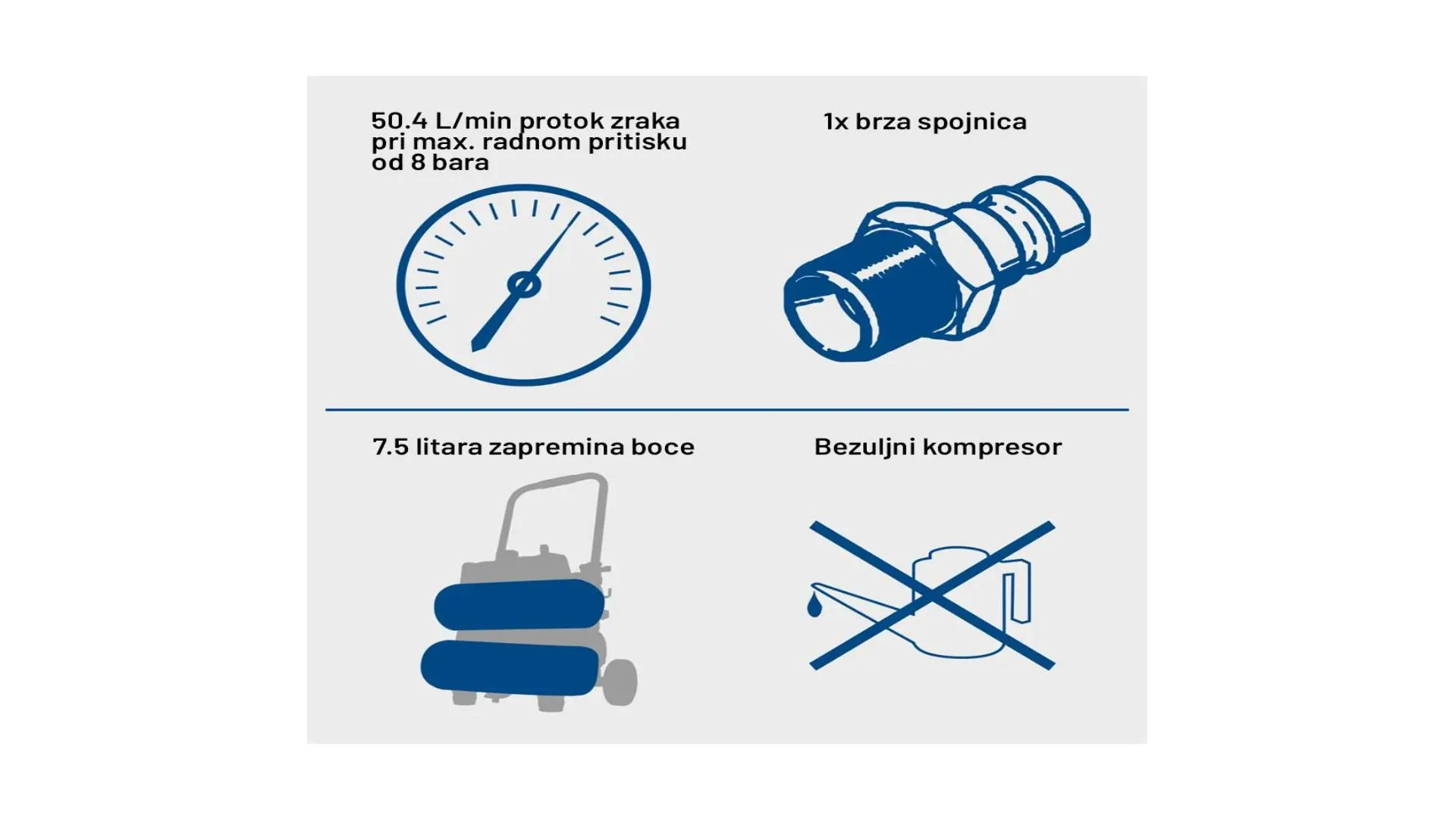Zahvaljujući dvostrukom rezervoaru ukupne zapremine 7,5 litara i snažnom motoru od 750 W, postiže maksimalni radni pritisak od 8 bara i obezbjeđuje dovoljno snage za napuhavanje guma, rad sa pneumatskim alatom, čišćenje komprimiranim zrakom ili punjenje lopti i madraca.
