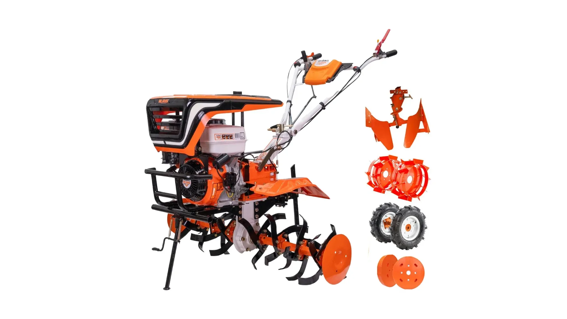 ⚙️ Dodatni pribor u paketu: gumeni i metalni kotači, reverzibilni plug Rev2 i tegovi 2×10 kg – sve što ti treba za obradu zemlje.