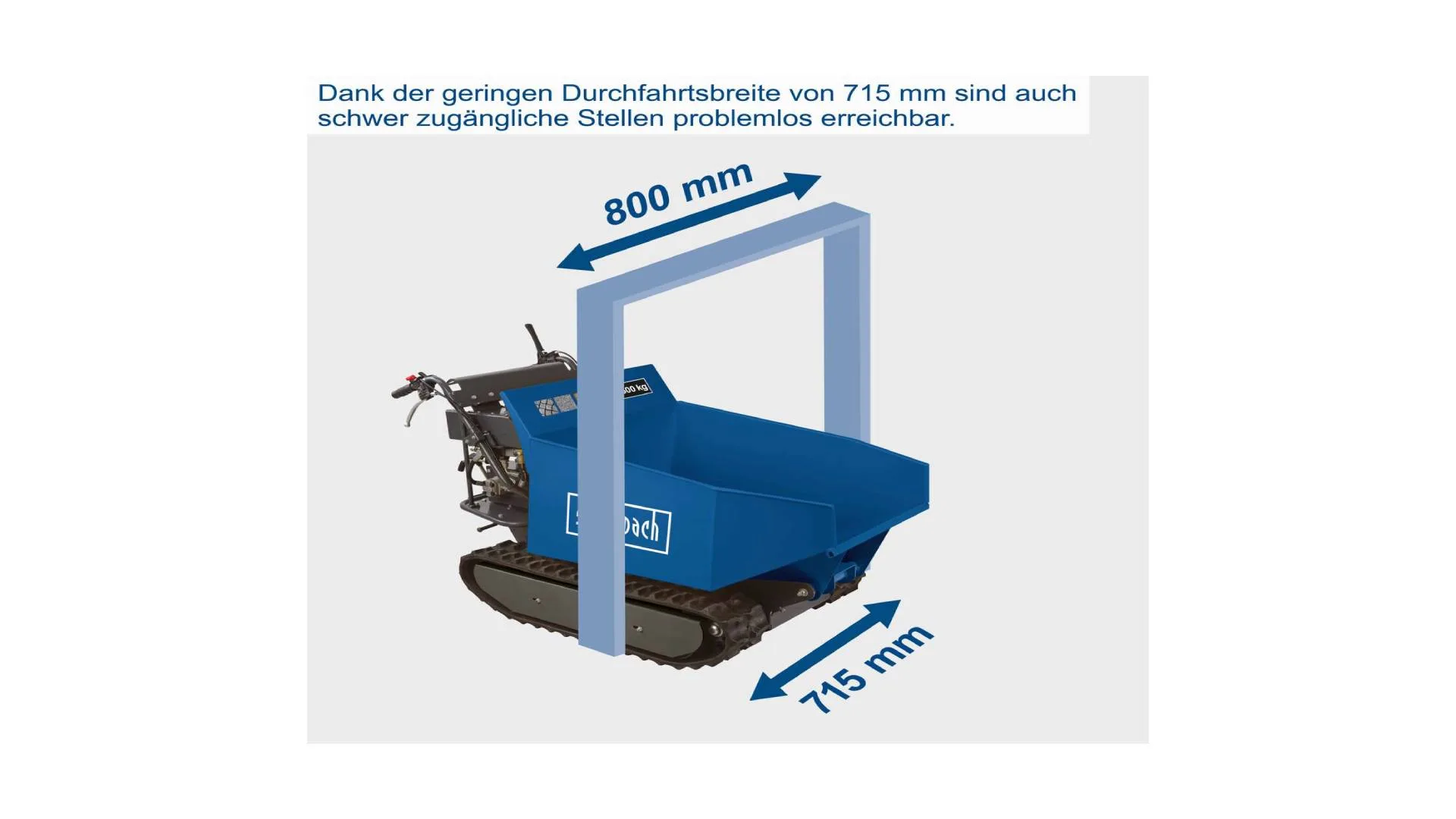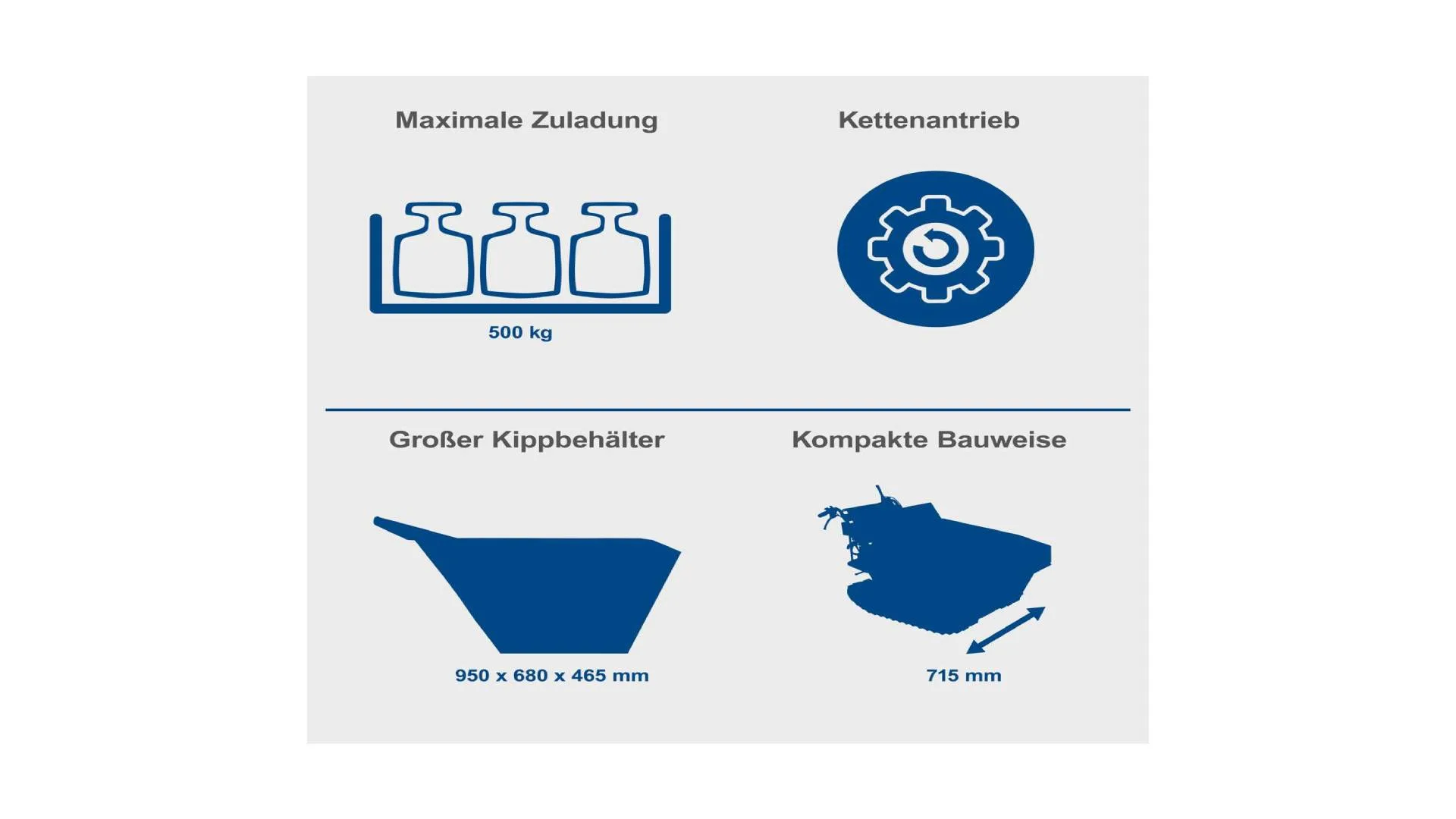 Njegova prostrana kiperska korpa dimenzija 950 x 680 x 465 mm omogućava lako prenošenje zemlje, šljunka, kamena, šute ili cigli, dok pogon na gusjenice osigurava stabilnost i jednostavno kretanje po neravnom terenu.