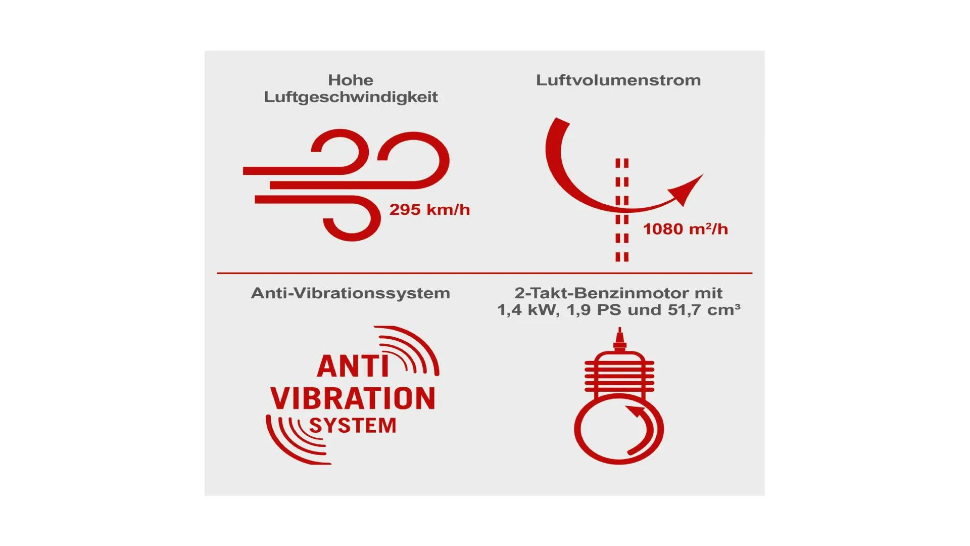 Opremljen je robusnim 2-takt benzinskim motorom sa 51,7 cm³ zapremine i snagom od 1,4 kW (1,9 KS), koji proizvodi impresivnu brzinu zraka do 295 km/h i maksimalni protok zraka od 18 m³/min (1080 m³/h).
