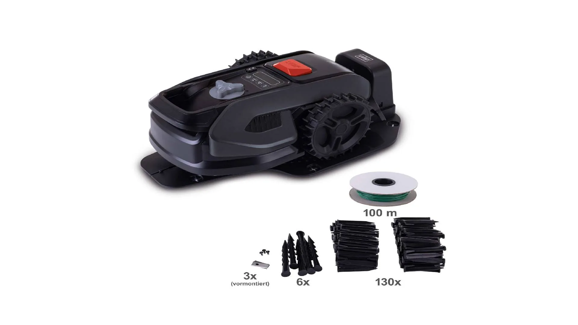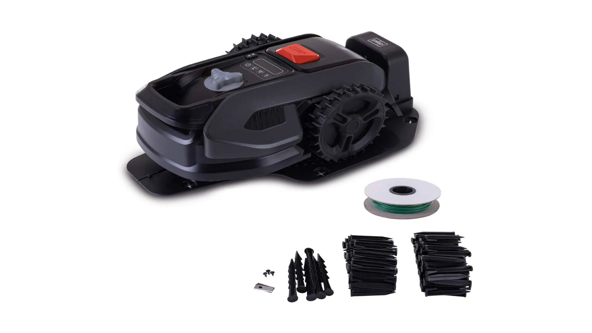 Kosilica se isporučuje sa 130 klinova i 100m žice za navođenje, 6 klinova za pričvrščivanje baze, stanicom za punjenje od 0.6 A, 6 noževa za kosilicu (3 montirana, 3 rezervna).