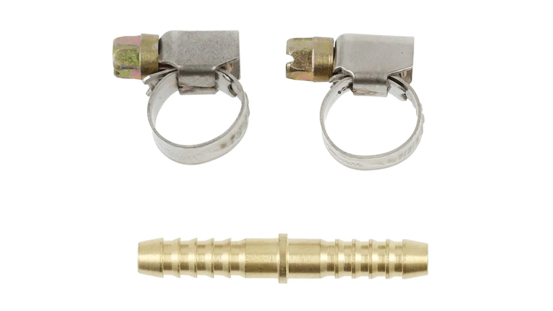 Set uključuje centralni mesingani priključak i dvije metalne stezaljke, omogućavajući čvrsto i sigurno spajanje crijeva prečnika od 8 do 12 mm.