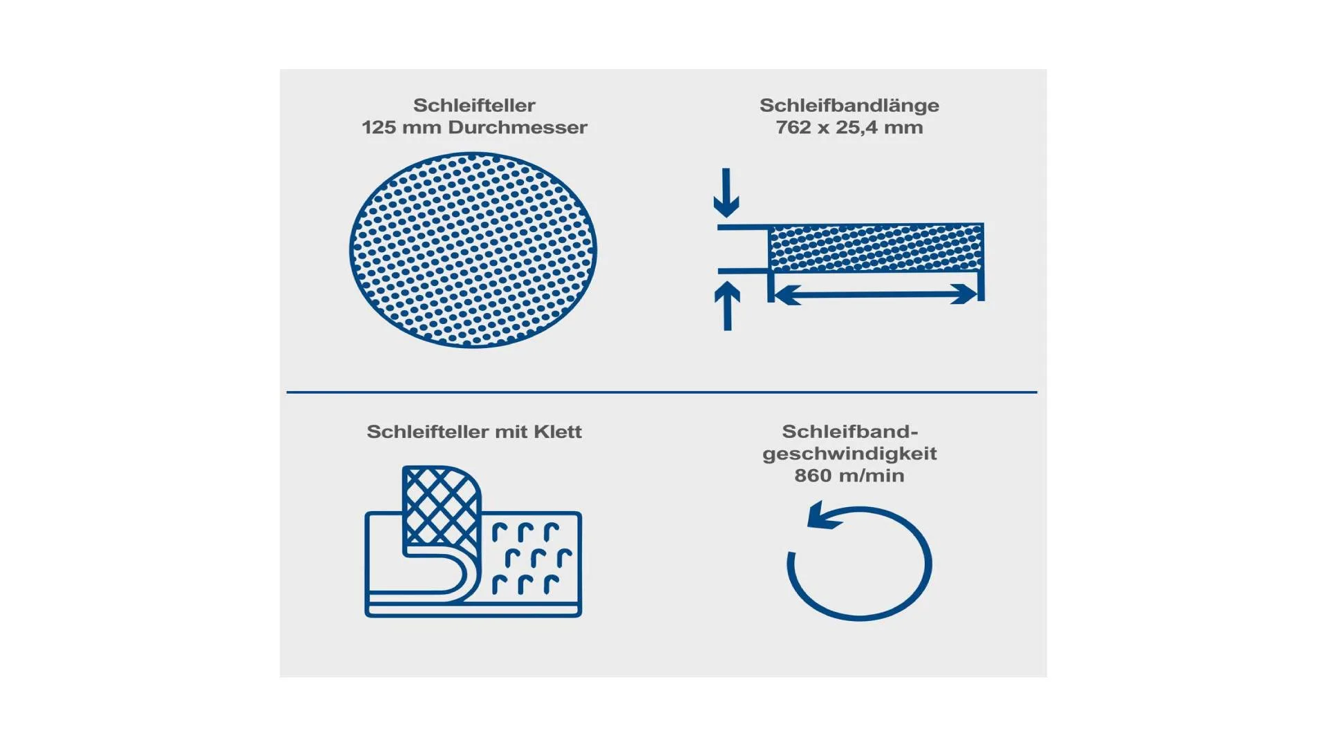 Disk brusilice prečnika 125 mm radi brzinom od 2850 o/min dok brusna traka ima dimenzije 762 x 25 mm i ima brzinu 820 m/min.