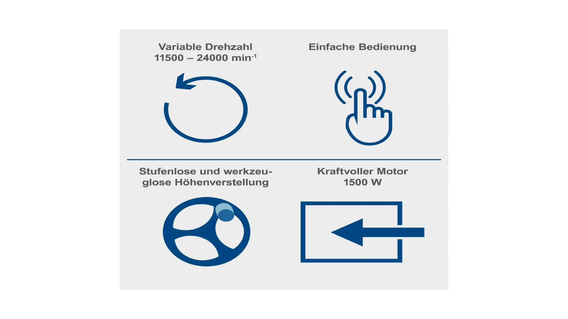 Opremljena je snažnim motorom od 1.500 W i promjenljivom kontrolom brzine od 11.500 do 24.000 o/min, što omogućava optimalnu obradu različitih materijala.