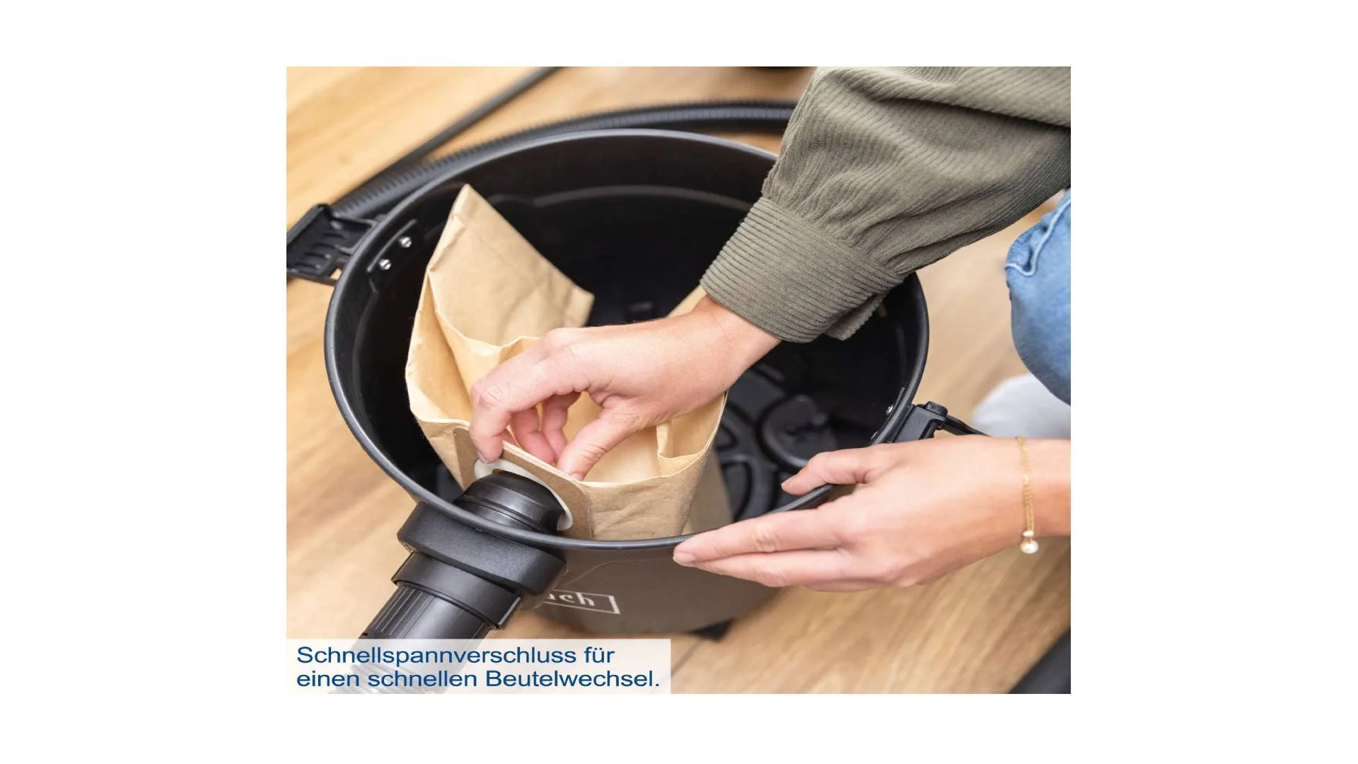 U paketu dolazi 1,8 m usisno crijevo, 3 plastična produžetka (33 cm), papirnata vreća (FSC-certifikat), spužvasti filter, nastavak za fuge i podni nastavak.